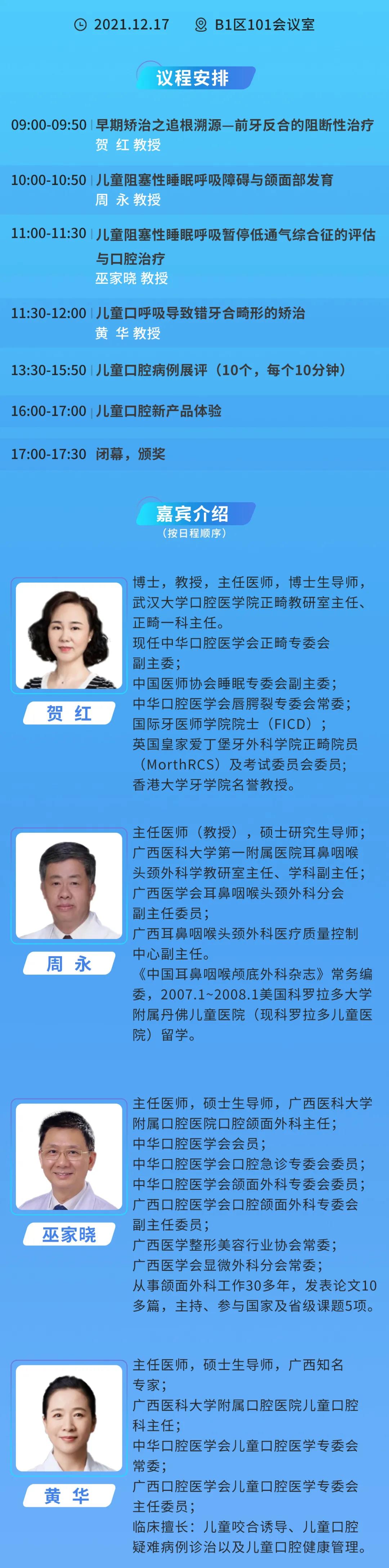 12月17日,儿童口腔医学专委会2021学术年会将在南宁会展中心B1区101会议室隆重召开,届时将邀请多名国内知名儿童口腔医学专家与大家一起共同探讨临床的新技术与新进展的最新动态。