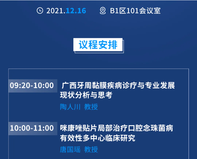 12月16日,牙周黏膜病学专委会2021学术年会将在南宁会展中心B1区101会议室隆重召开,届时将邀请口腔领域牙周黏膜知名专家与大家一起交流学术思想、拓展学术视野,共同进步和提高。