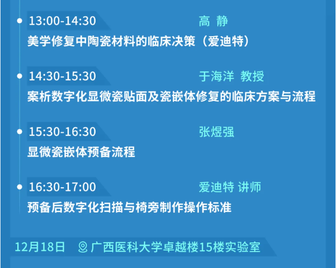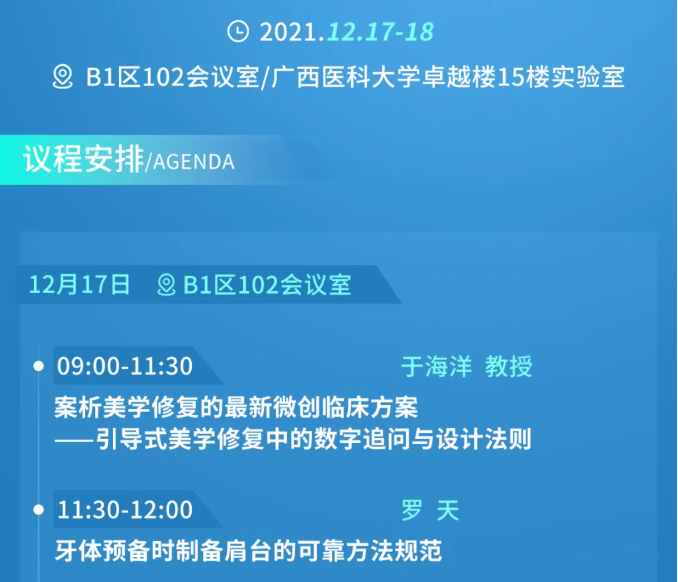 12月17日,口腔修复学专委会2021学术年会将在南宁会展中心B1区102会议室隆重召开,12月18日相关实操课程将在广西医科大学卓越楼15楼实验室开办,届时将邀请国内口腔修复学知名专家于海洋教授及其团队与大家一起共同探讨临床的新技术与新进展的最新动态。