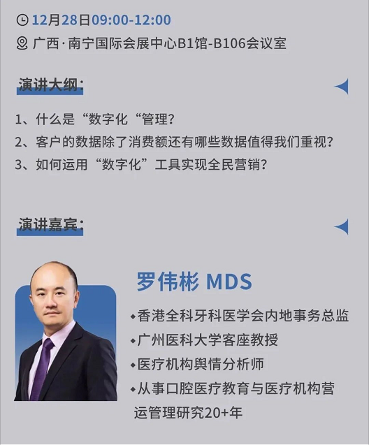 12月28日09:00-12:00,管理专场《“数字化”在牙科机构运营管理中的应用解析》将在南宁国际会展中心B1区106会议室开办,届时欢迎大家莅临参会,一起学习交流!