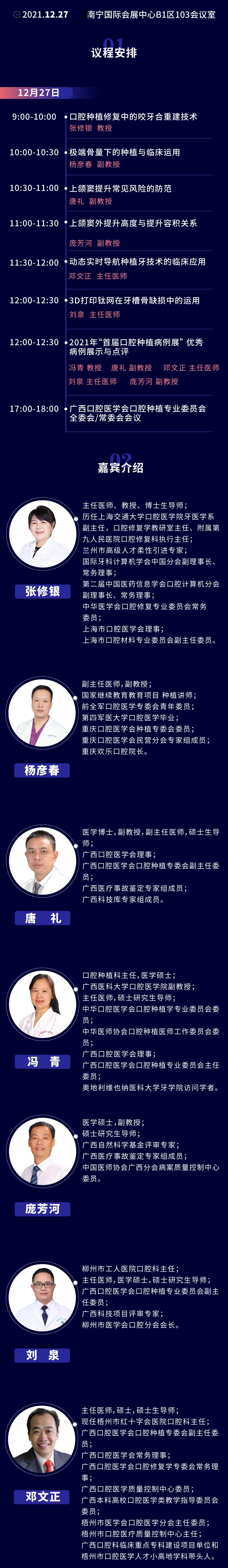 12月27日 ,口腔种植专委会2021学术年会将在南宁会展中心B1区103会议室隆重召开,届时将邀请多名国内知名口腔种植专家与大家一起共同探讨临床的新技术与新进展的最新动态。