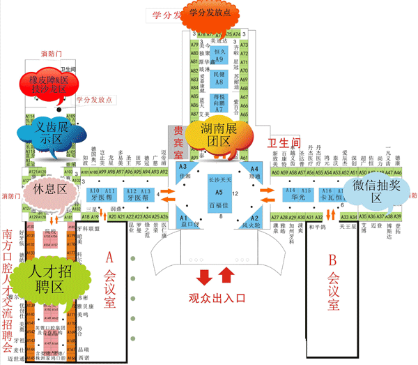 A会议室、B会议室、湖南展团区、人才招聘区、义齿展示区、微信抽奖区、沙龙活动区、休息区、学分发放点