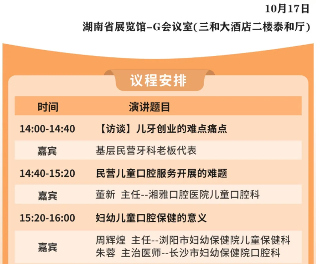 为广泛而深入交流口腔医疗技术经验,大会在举办一系列研讨会的同时,同期举办“儿牙专场-从家园管理探索湖南儿牙市场拓展之路”活动。我们热忱的欢迎各位口腔同行一起来到现场参会交流!