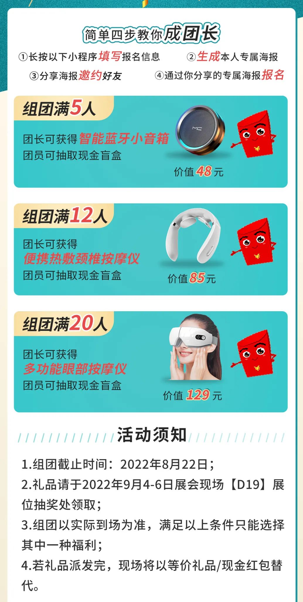会前短信提醒,避免错过会期; 现场无需耗时排队登记,直接取证入场; 完成预报名,现场可领取抽奖券一张(100%中奖); 8月22日前预报名,可邀请好友参会,领取组团福利。