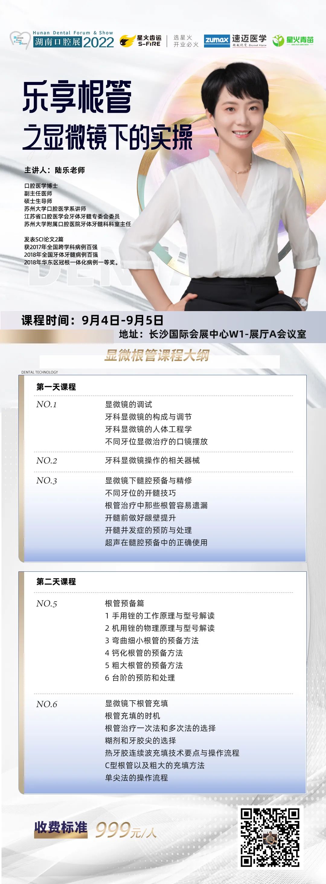 本届大会第一、二天即9月4-5日,在长沙国际会展中心W1馆-展厅A会议室—开办为期2天的《乐享根管之显微镜下的实操》,本次课程由陆乐老师与你一起通过“理论+实操”的方式,由浅入深地学习探讨显微根管的相关知识。