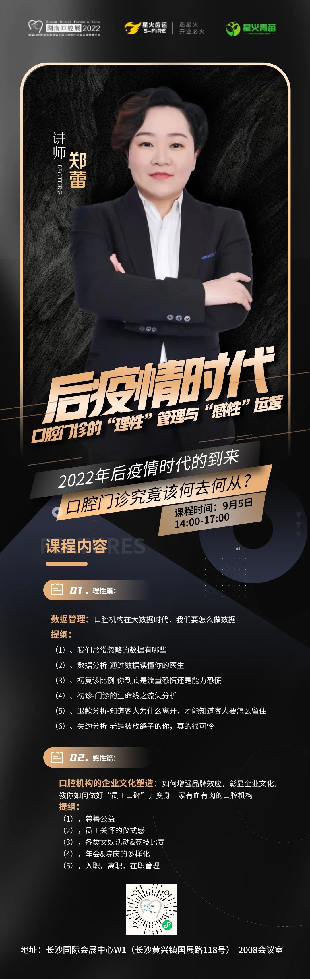 本届大会第二天即9月5日,在长沙国际会展中心W1馆-2008会议室—开办《口腔新媒体运营专场》,由郑蕾老师为大家带来“后疫情时代,口腔门诊的‘理性’管理与‘感性’运营”,欢迎各位口腔同行届时到现场一起探讨交流!