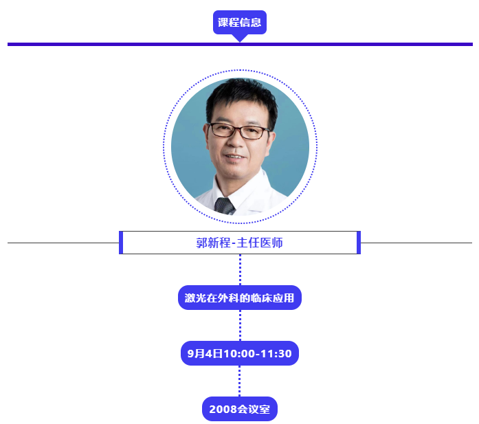本届大会第一天即9月4日,在长沙国际会展中心W1馆-2008会议室—开办《激光专场》,由郭新程老师给大家带来“激光在外科的临床应用”主题分享,欢迎各位口腔同仁莅临现场学习交流!