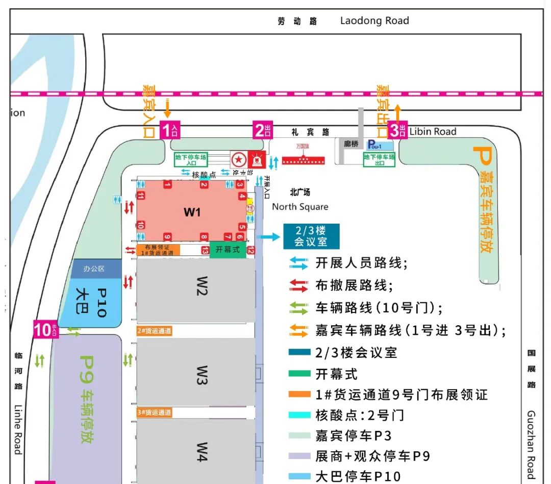 (*布撤展车辆统一在1号货运通道卸货,小车从10号门进出停车场P9,货车从9号门进出停车场P8。)