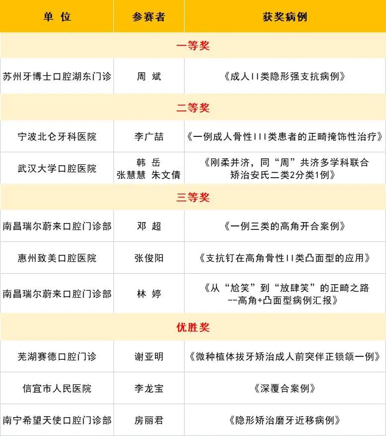 既是比赛就会有名次,但名次的先后并不意味着医生治疗水平的高低。华中口腔正畸优秀病例评选大赛举办的初衷也并非为了评判优劣,我们只是希望通过大赛评选的方式看到更多医生不同的治疗方法和表达方式,以此来激发大家对口腔正畸治疗更多的思路和想法,相互学习和共同进步才是这个大赛真正的意义。