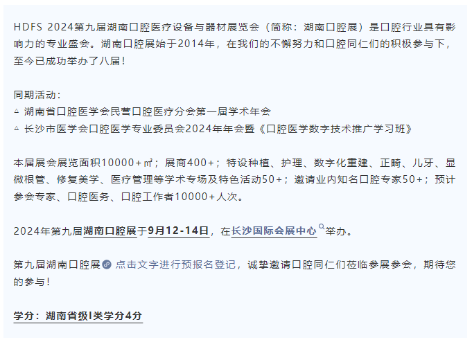 展会举办时间:2024年9月12-14日 地点: 长沙国际会展中心W1馆(长沙黄兴镇国展路118号) 公司地址:广州天河区王园路33号智汇商务园C1栋401室 电话:020-82567179 传真:020-82567179 联系人: 陈小姐 E-mail:13570109723@163.com 大会官网: http://www.dentalshow.com.cn 本站关键词: 口腔展,牙科展,中华口腔医学会,华南口腔展,南方牙科展