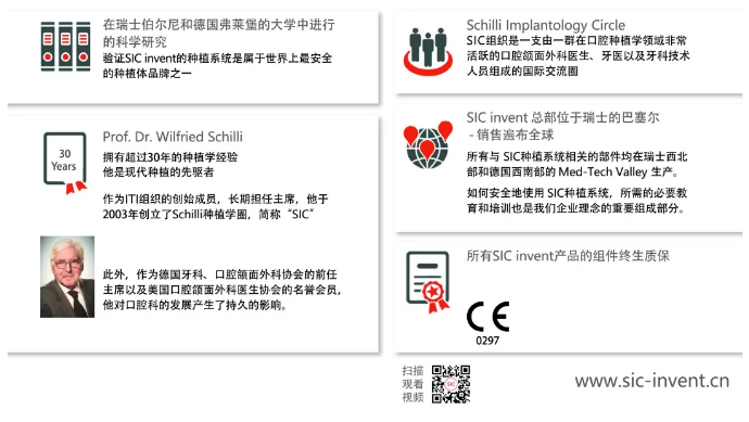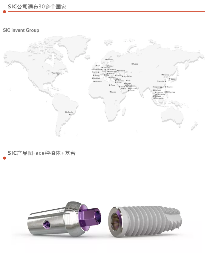 SIC invent于2003年在瑞士巴塞尔成立,如今,在全球拥有了自己的直属子公司和优质的分销合作伙伴,足迹遍布全球30多个国家。兼具瑞士和德国的研发创新和制造的基因优势的SIC种植体,致力将高科技、高质量的产品和解决方案带给行业,造福牙缺失群体。SIC主推高端市场定位,追求精密品质,又贴近终端用户,病患友好,旨在为大家提供负责任的口腔医疗产品!