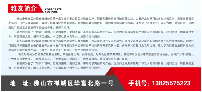 佛山市雅友医疗设备有限公司是一家专业从事口腔医疗设备研发、生产、销售和服务的高科技民营企业,主要产品有牙科综合治疗机系列、全球专属卡通儿童牙科综合治疗机系列、高温高压消毒炉系列、口腔无痛麻醉仪、各种牙科器械、配件、耗材系列等等。面对国际竞争国内化、国内竟争国际化的格局,雅友以“团结创业、以人为本、诚信经营、以质取胜”的经营方针赢得了顾客的青睐,赢得了市场。