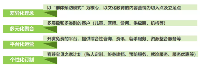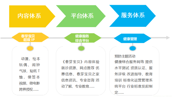 春芽健康在国内首倡的儿童口腔健康“群体预防模式”,借助《春芽宝贝》动漫以及绘本、玩偶、形象贴纸等衍生品以及线下体验场景,聚合家庭、学校(教育机构)、医院诊所(医疗机构)、媒体、行业机构并组织多方力量打造春芽预防保健服务体系,共同宣导普及儿童口腔健康的预防知识、措施,并提供专业、资源、资金、服务等多方面支持,为0-14岁儿童提供“预防为主专业保护” 的综合口腔健康服务。