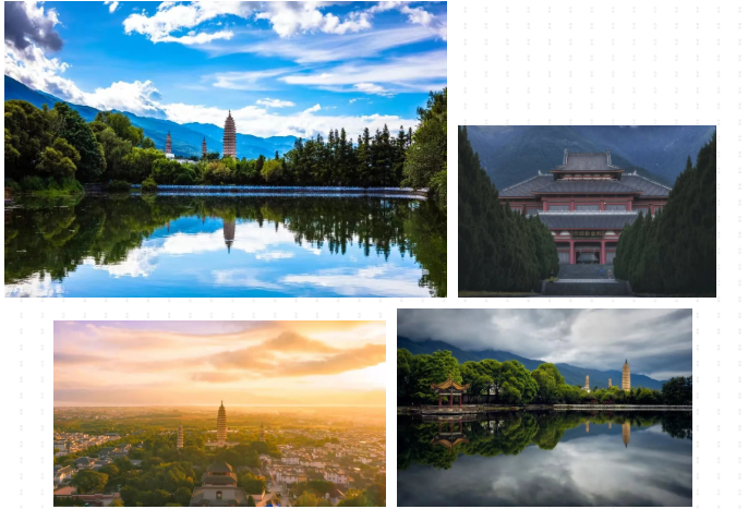 大理崇圣寺三塔,距离下关14千米,位于大理以北1.5千米苍山应乐峰下,背靠苍山,面临洱海,三塔由一大二小三座佛塔组成,呈鼎立之态,远远望去,雄浑壮丽,是苍洱胜景之一。