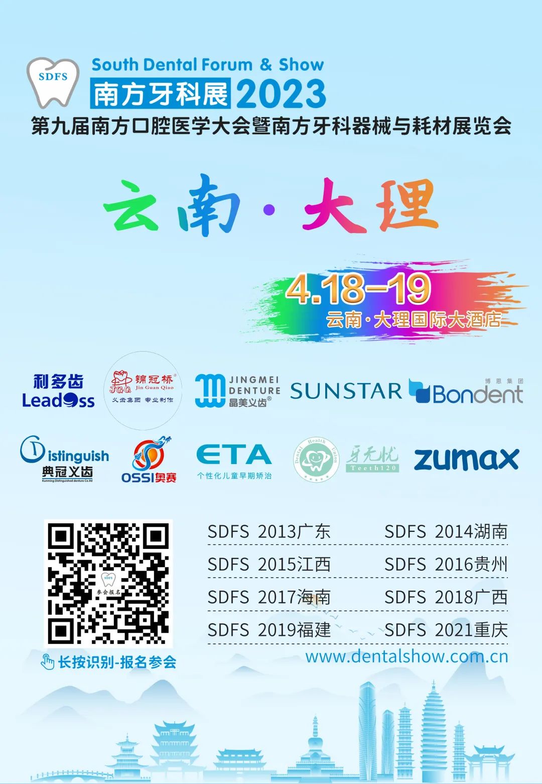 “SDFS 南方口腔医学大会暨南方牙科器械与耗材展览会”(简称:南方牙科展)已连续举办了八届,今年4月18-19日第九届南方牙科展将巡回至云南·大理(会议地点:大理国际大酒店)。