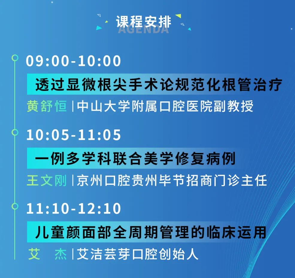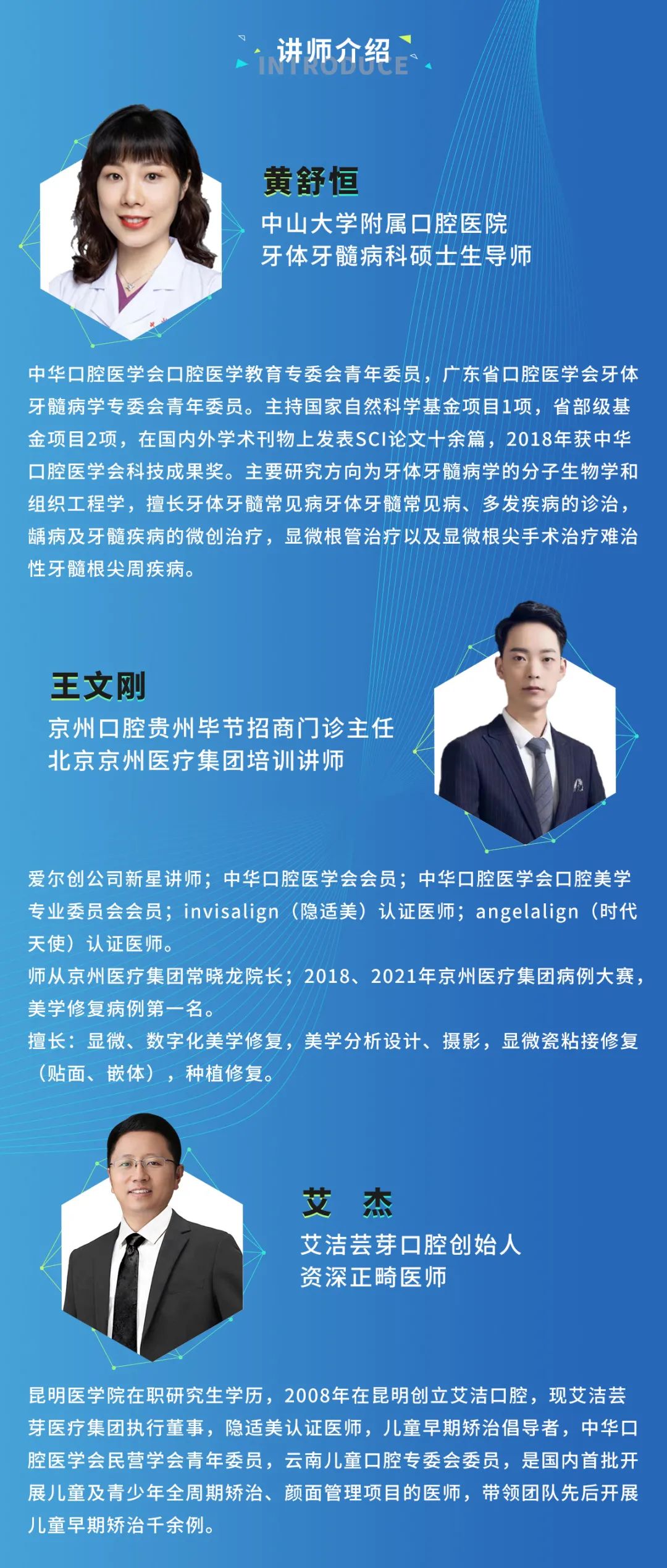 本次《青年医师论坛》由:来自中山大学附属口腔医院的黄舒恒老师,来自京州口腔的王文刚老师,来自艾洁芸芽口腔的艾杰老师,一起为大家带来专题分享。