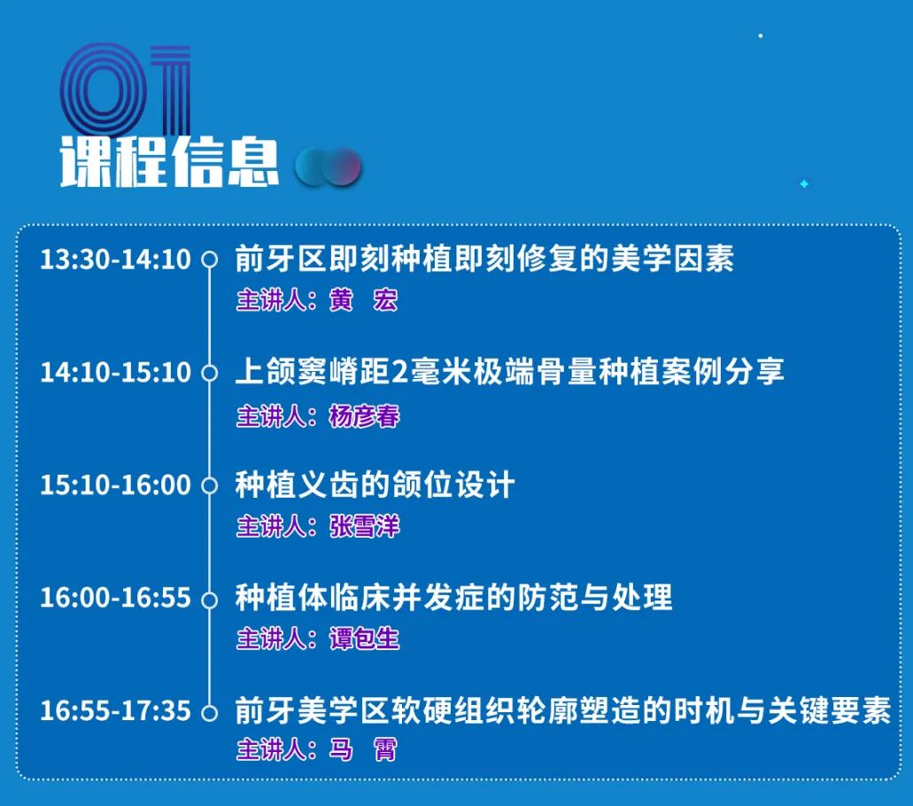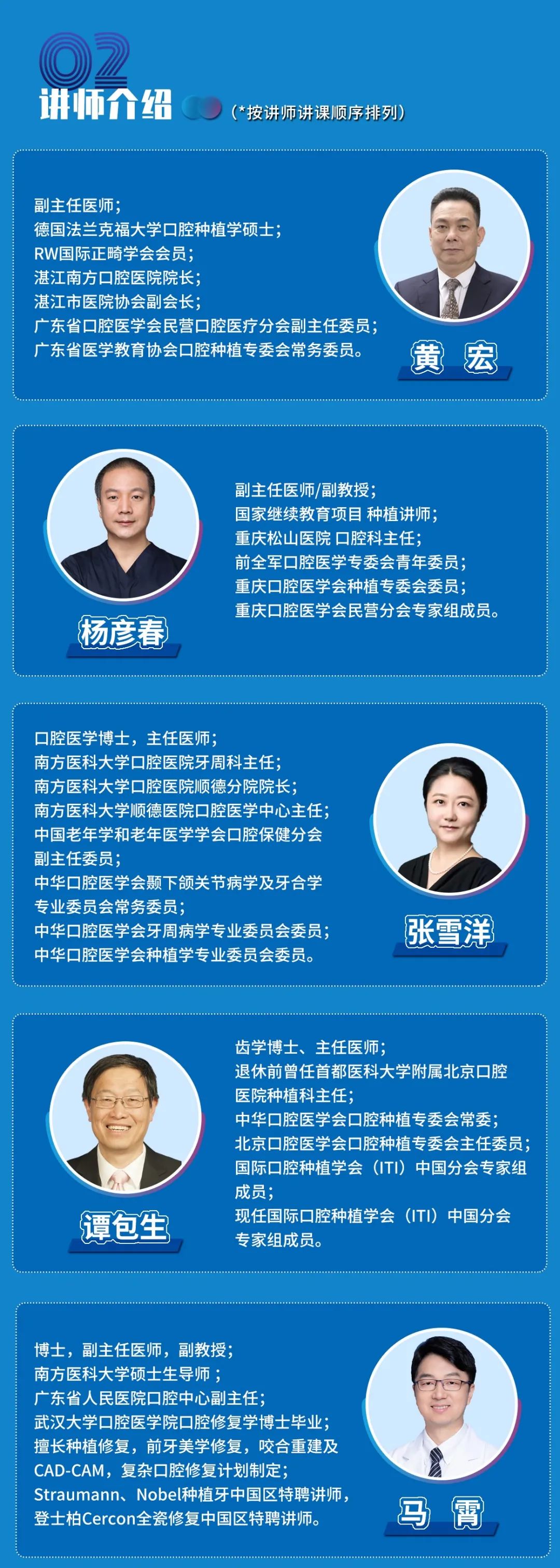 本次《种植专场》由:湛江南方口腔医院院长黄宏,重庆松山医院口腔科主任杨彦春,南方医科大学口腔医院顺德分院院长张雪洋,曾任首都医科大学附属北京口腔医院种植科主任的谭包生,广东省人民医院口腔中心副主任马霄,五位老师一起为大家带来专题分享。