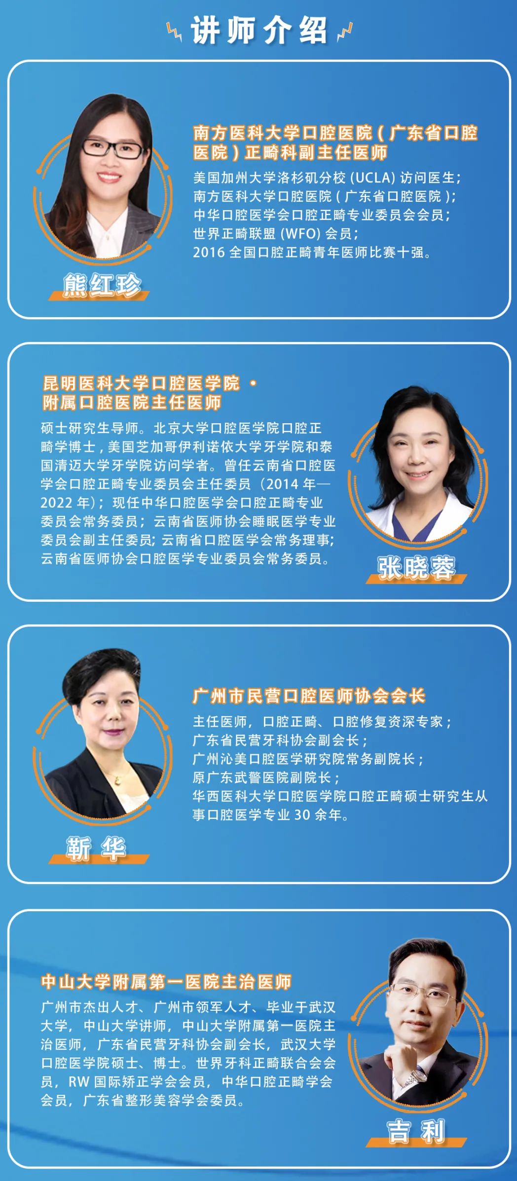 本次《正畸专场》由:南方医科大学口腔医院(广东省口腔医院)正畸科熊红珍老师,昆明医科大学口腔医学院·附属口腔医院张晓蓉老师,广州市民营口腔医师协会会长靳华老师,中山大学附属第一医院吉利老师,一起为大家带来专题分享。
