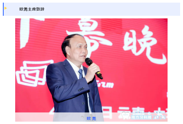 开幕晚宴上,南方牙科联盟主席欧尧发表讲话。他首先对参加本次大会的所有参会观众、企业、嘉宾讲师等,表达了衷心的感谢和诚挚的问候。他表示,南方口腔医学大会能够顺利举办至如今的第九届,离不开南方牙科联盟各省市代表团的大力支持和热情参与。本次南方口腔医学大会大理之行,一是希望大家在专业上能够有所收获。二是希望大家都能够有一段美好而难忘的旅行。