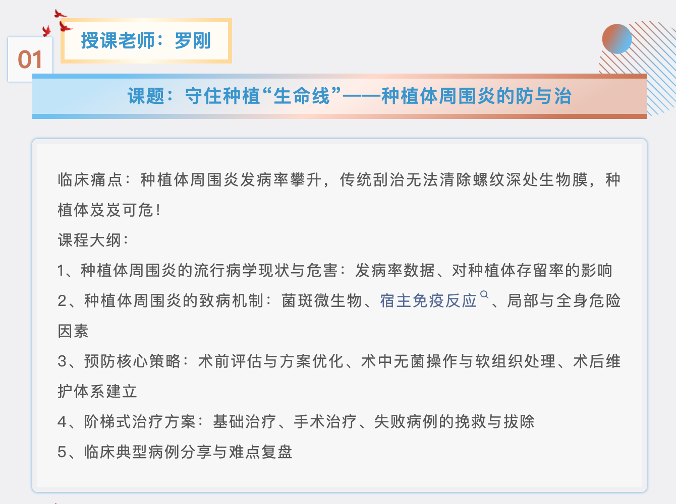 - 主题:多学科交叉病例的诊疗协作(如种植体周围炎合并牙周病、根管治疗后拔牙修复)